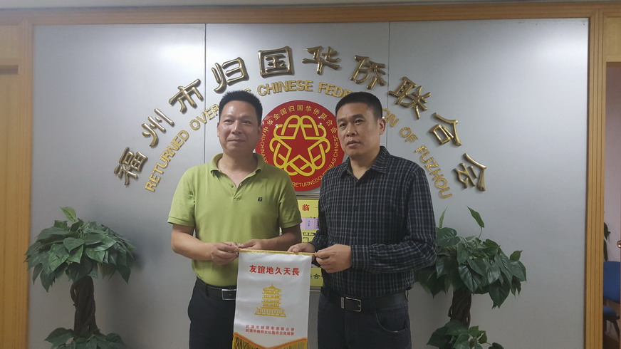 市侨联副主席徐祥忠与福州市侨联副主席林良明交换会旗