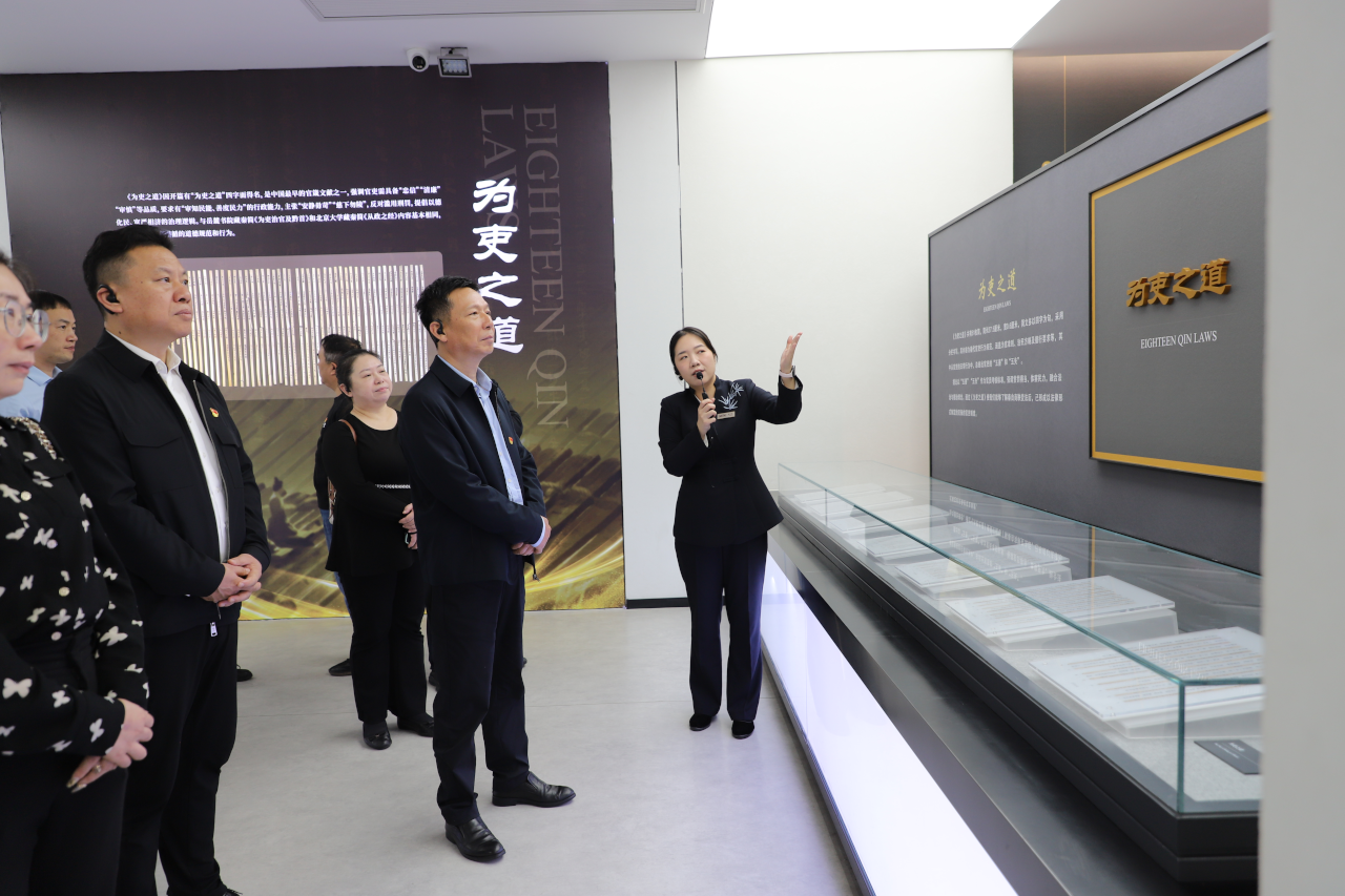 活动首站是参观坐落于梦泽湖畔的孝感市云梦县博物馆,这座仿秦风格的建筑内,5000余件馆藏文物静静诉说着千年故事。大家追寻着总书记的脚步,深入学习了习近平总书记考察时的重要指示精神,重点参观了“睡虎地秦简专题展”,研读了《秦律十八种》《为吏之道》等珍贵简牍,了解了中华法系源头与古代廉政文化,将“吏有五善、吏有五失”等历史智慧转化为新时代党员的履职担当。